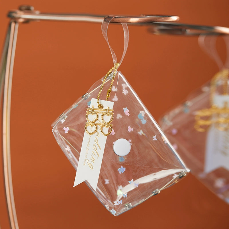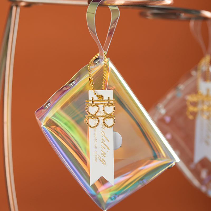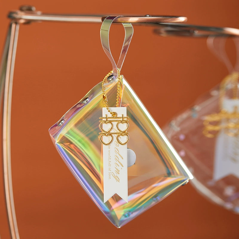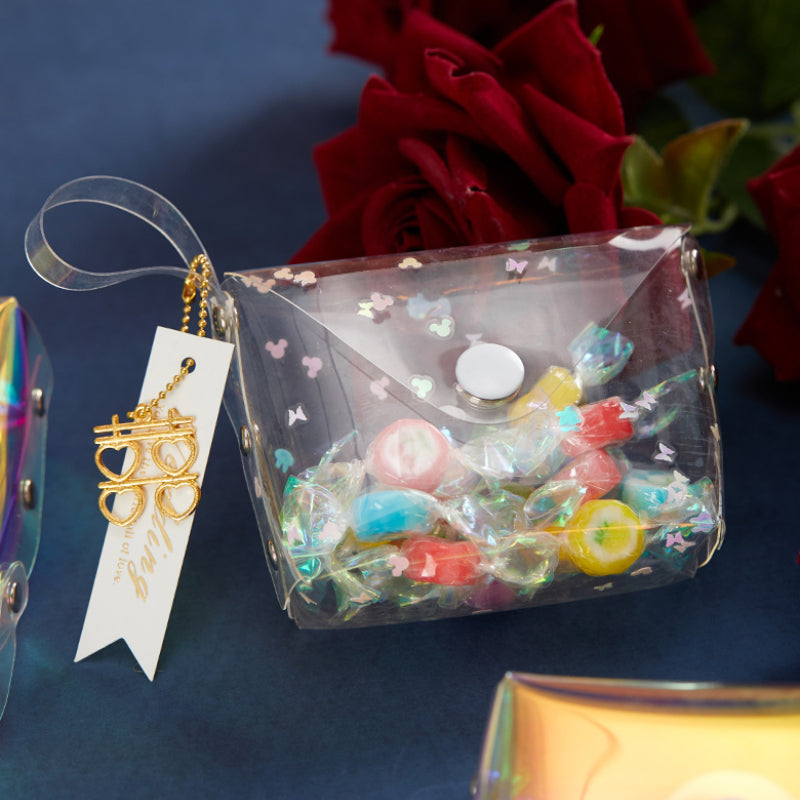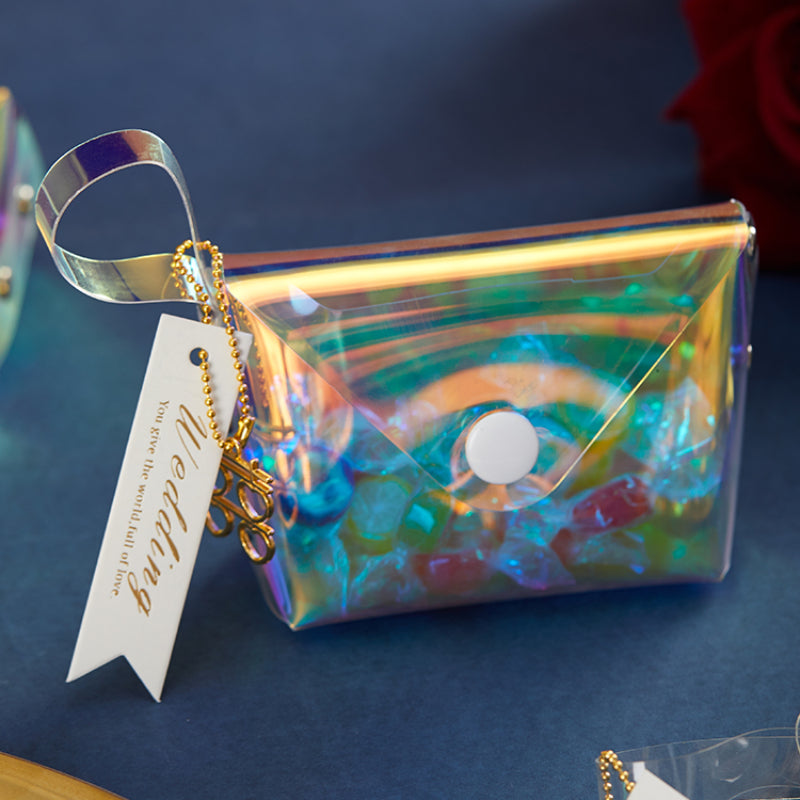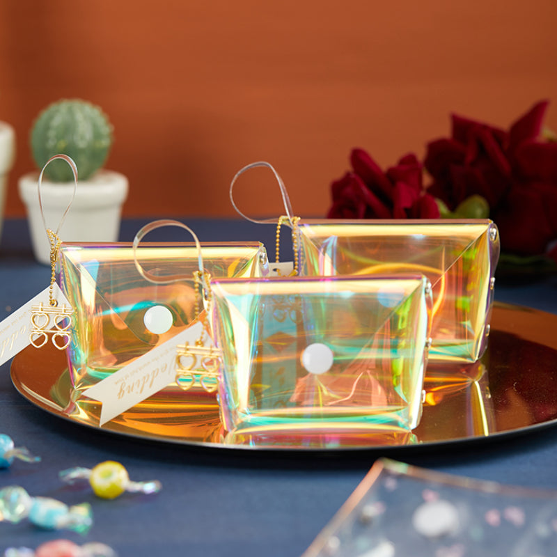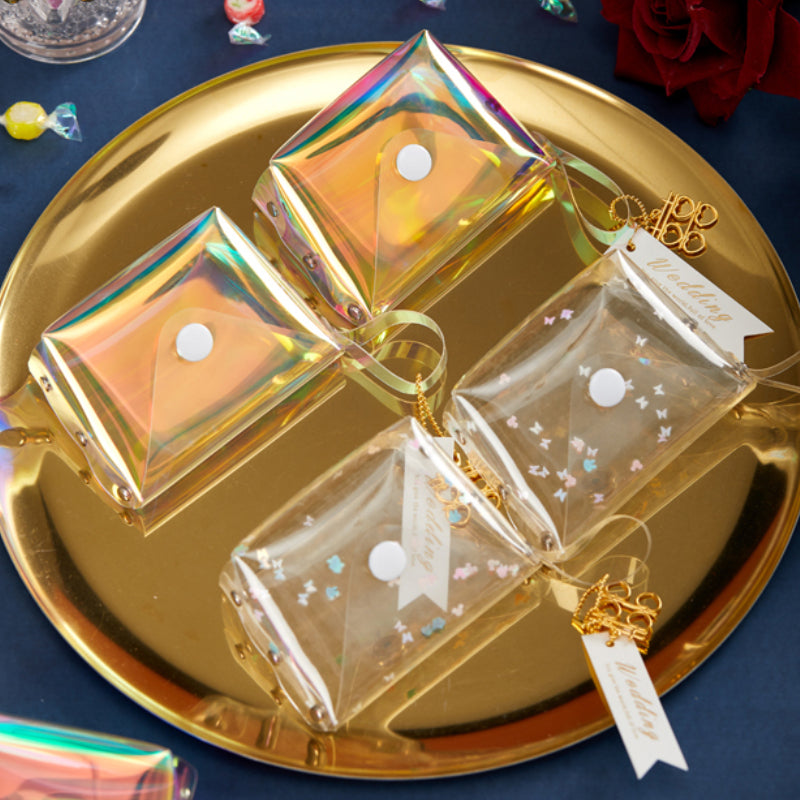 حقيبة هدايا شفافة عاكسة ملونة مقاومة للماء مصنوعة من مادة البولي فينيل كلوريد بالليزر وحقيبة سكر للزفاف